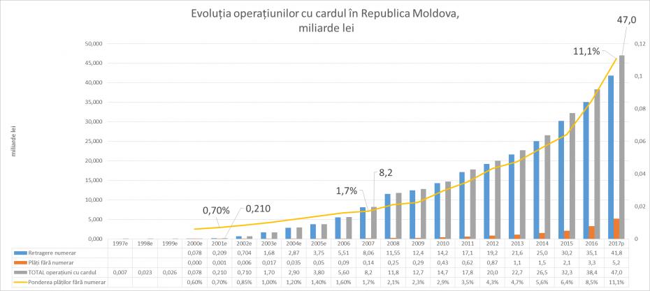 În 2017 volumul plăților cu cardul bancar conform estimărilor noastre vor înregistra cifra record de 47 miliarde lei o creștere față de anul precedent cu circa 30%, ceea ce înseamnă că moldovenii trec de la salariul în plic la remunerarea pe card.