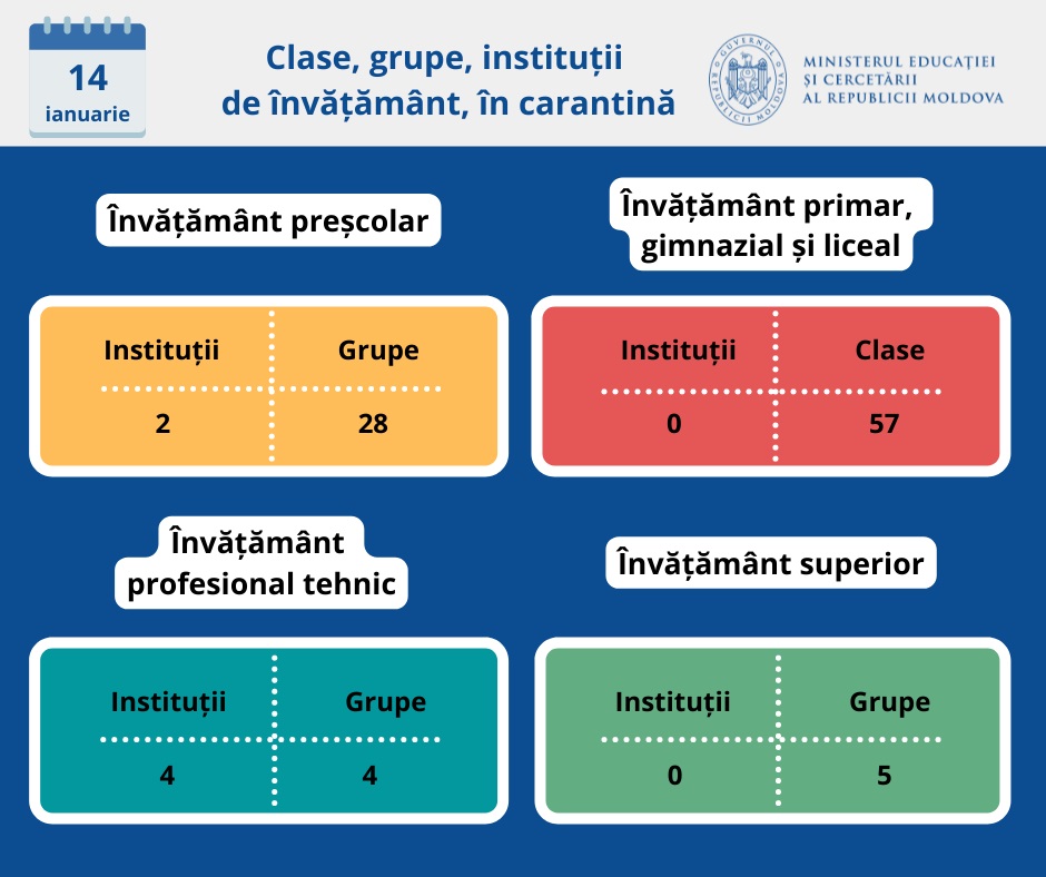 Potrivit datelor publicate de Ministerul Educației și Cercetării, situația epidemiologică în instituțiile de învățământ din Republica Moldova este următoarea: în școli sunt 289 de cazuri active de COVID-19 în rândul elevilor și 133 în rândul cadrelor didactice, iar în grădinițe au fost identificate în total 16 cazuri la copii.