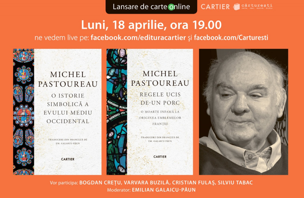 Luni, 18 aprilie, ora 19.00, sunteți invitați la lansarea online a volumelor „O istorie simbolică a Evului Mediu occidental și Regele ucis de-un porc. O moarte infamă la originea embelemelor Franței”, de Michel Pastoureau, traduse din franceză de Em.Galaicu-Păun, apărute la Editura Cartier în colecția Cartier istoric.