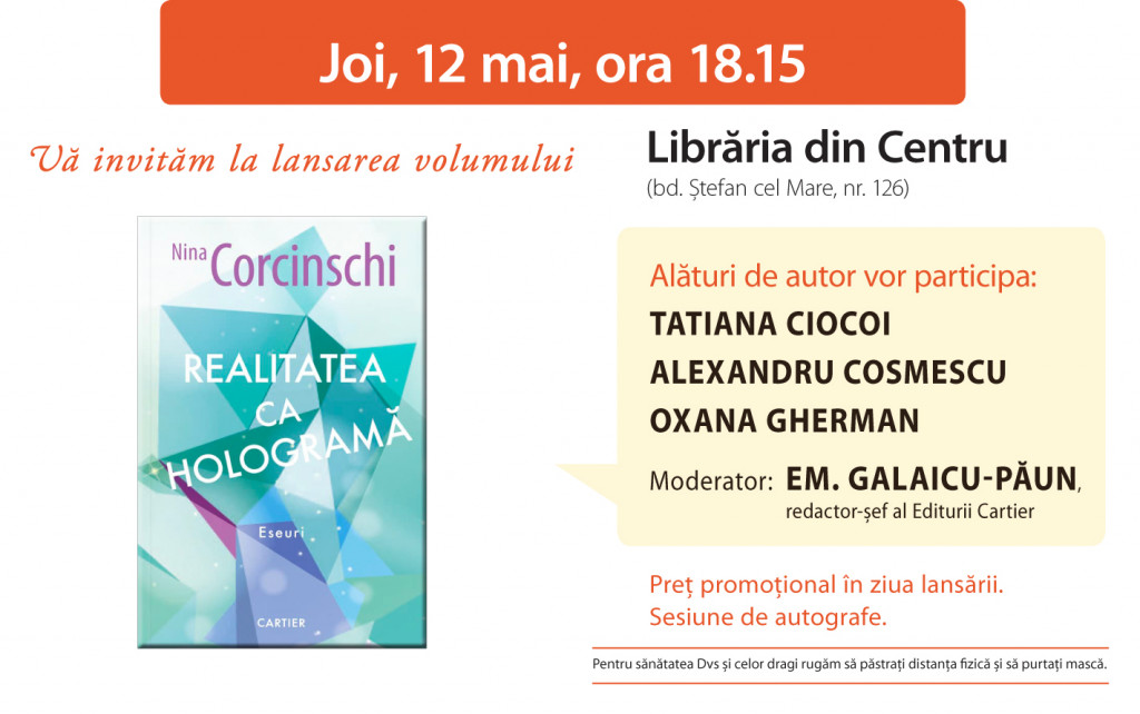 Librăria din Centru, te invită joi, 12 mai, la ora 18.15, la lansarea volumului „Realitatea ca hologramă”, de Nina Corcinschi, apărut la Editura Cartier în colecția Rotonda, coordonată de Emilian Galaicu-Păun.