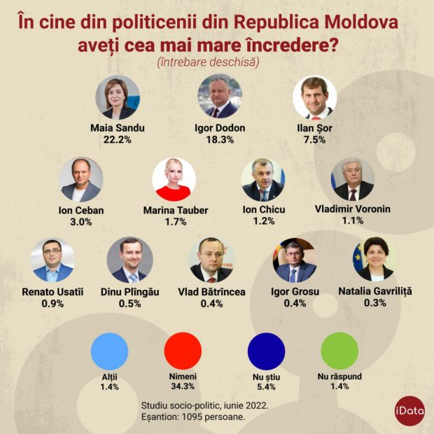 Potrivit sondajului realizat de iData, Maia Sandu are cea mai mare încredere din partea populației, acumulând 22,2 %. Topul politicienilor care le inspiră încredere moldovenilor mai este completat de Ceban, Voronin, Tauber, Chicu, Gavrilița, Grosu, Plîngău și Usatîi.