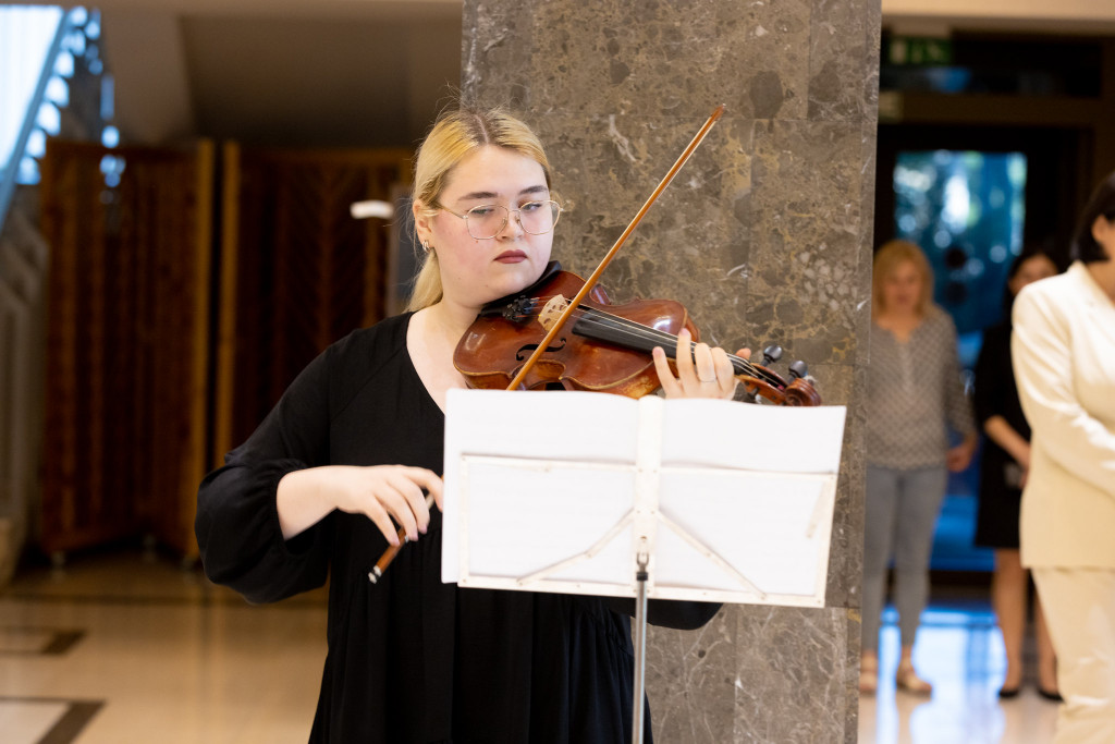 Atmosfera de la expoziție a fost întregită de recitalul de vioară, oferit de Facultatea de Artă Muzicală. Un moment de excepție a fost prilejuit de monologul pus în scenă de Facultatea de Artă Teatrală, Coregrafie și Multimedia, vizitatorii având ocazia să savureze interpretarea unui fragment din tragedia „Regele Lear” de William Shakespeare.