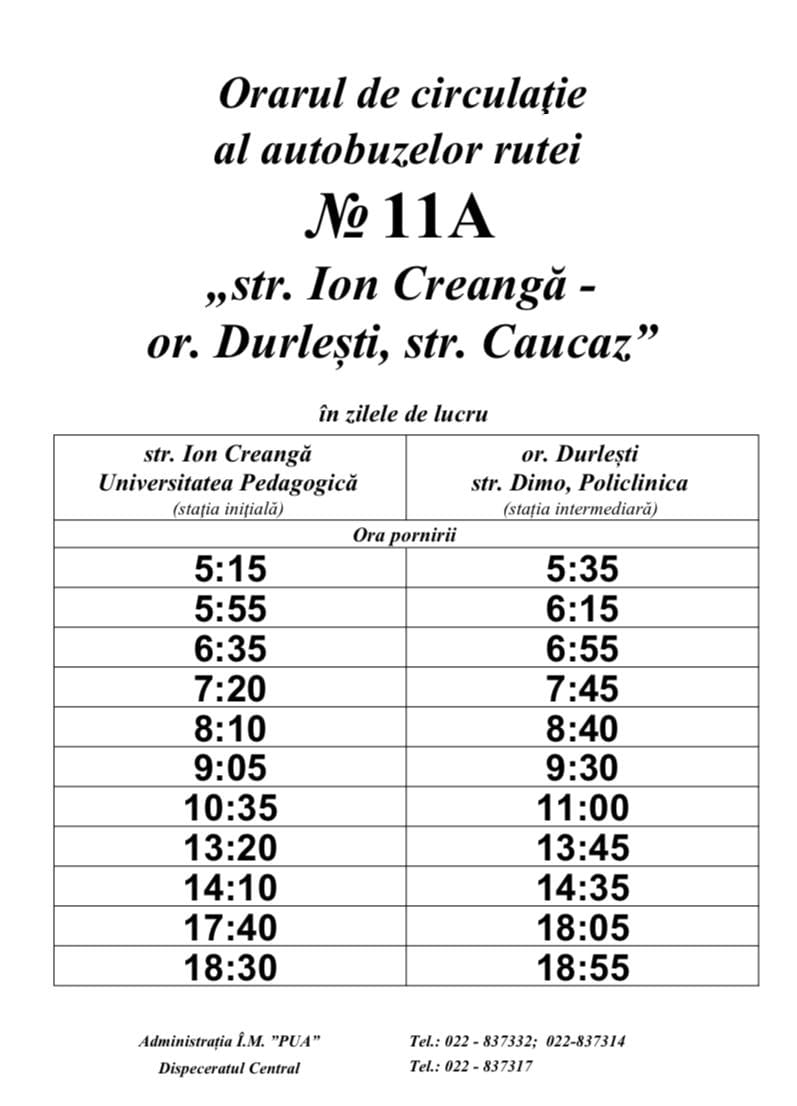 Începând cu 4 septembrie curent, va fi pusă în circulație o nouă rută suburbană de autobuz care va face legătura între orașul Durlești și capitală. Primăria municipiului Chișinău a anunțat într-o postare pe Facebook că se instituie ruta suburbană de autobuz numărul 11 A.