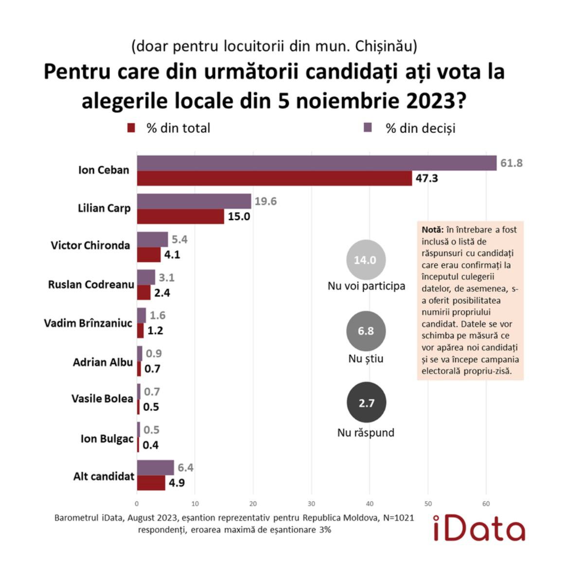 Conform unui sondaj realizat de iData, la alegerile locale din 5 noiembrie 2023, Ion Ceban (MAN) ar câștiga mandatul de primar de Chișinău cu 47,3 % din voturile totale și cu 61,8 % din voturile decise. Acesta ar fi urmat de Lilian Carp (PAS) și Victor Chironda (Platforma DA).