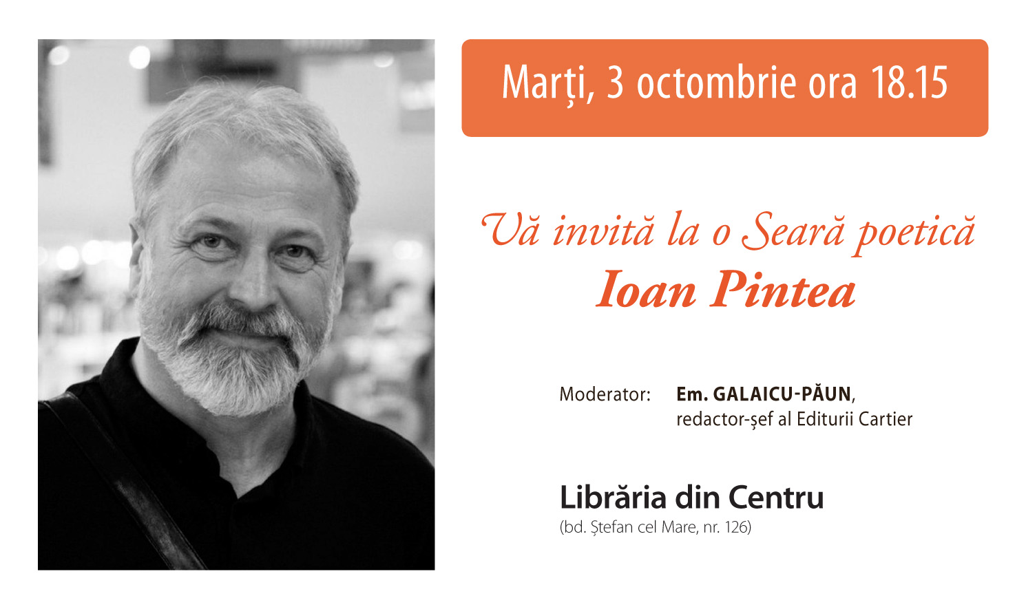 Marți, 3 octombrie, la ora 18.15, va avea loc o seara poetică Ioan Pintea la Librăria din Centru, eveniment în cadrul Proiectului „Cartea deschisă”.