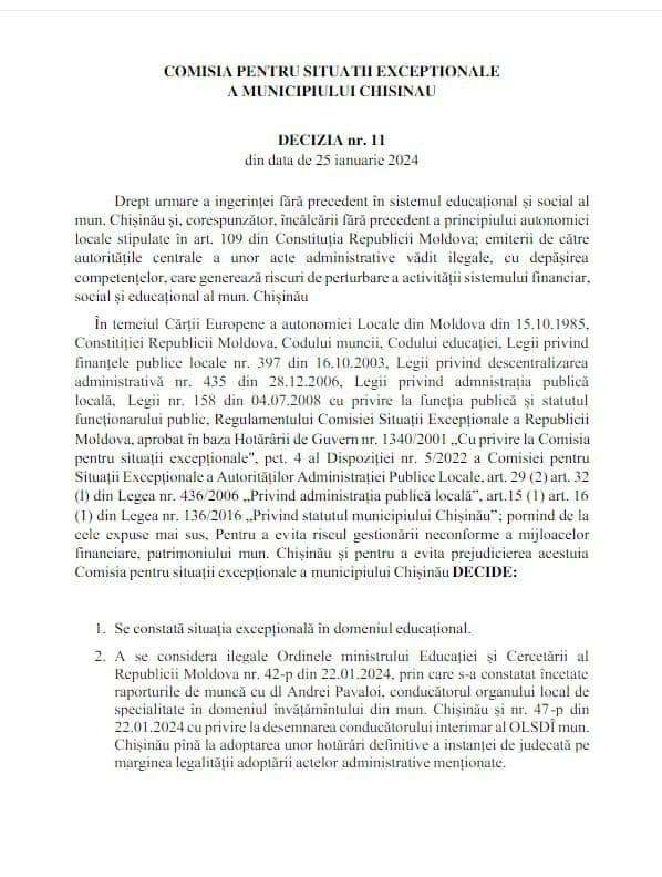 Primarul municipiului Chișinău, Ion Ceban, a postat pe Facebook o hotărâre a Comisiei pentru Situații Excepționale (CSE) din Chișinău prin care se declară situație excepțională în domeniul educației din Chișinău. Hotărârea menționează că Andrei Pavaloi, demis recent de Guvernul Republicii Moldova pentru că a fost angajat fără concurs, va continua să își exercite funcția pe șef al Direcției Educație a municipiului Chișinău. Zinaida Popa, consiliera PAS în Consiliul Municipal Chișinău (CMC), a menționat că va sesiza Cancelaria de Stat în legătură cu decizia luată de CSE Chișinău, menționând că „ceea ce face Ion Ceban prin comisiile situațiilor excepționale este dosar penal”.