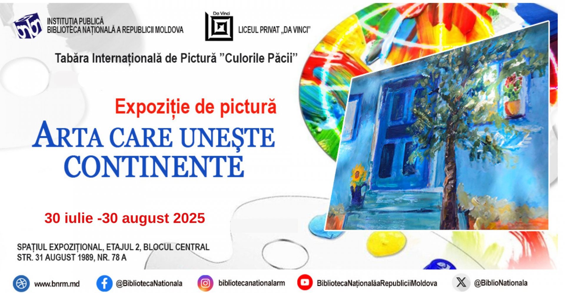 Biblioteca Națională a Republicii Moldova găzduiește, pe parcursul lunii august, expoziția de pictură „Arta care unește continente”, parte a Salonului de Artă al instituției. Aceasta reunește 53 de lucrări realizate de artiști din Republica Moldova, România, Germania, Regatul Unit și Emiratele Arabe Unite, participanți la Tabăra Internațională de Pictură „Culorile Păcii”.