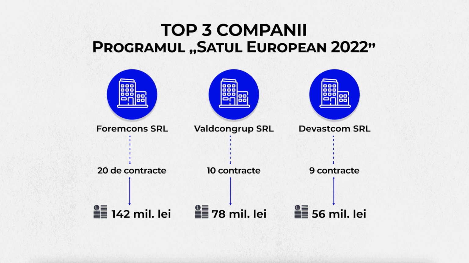 Potrivit datelor publicate pe site-ul Agenției Achiziții Publice, Valdcongrup SRL câștigă constant contracte pe bani publici. Mai exact, în ultimii trei ani, a semnat 17 contracte cu mai multe autorități și instituții publice, în sumă totală de peste 134 de milioane de lei.