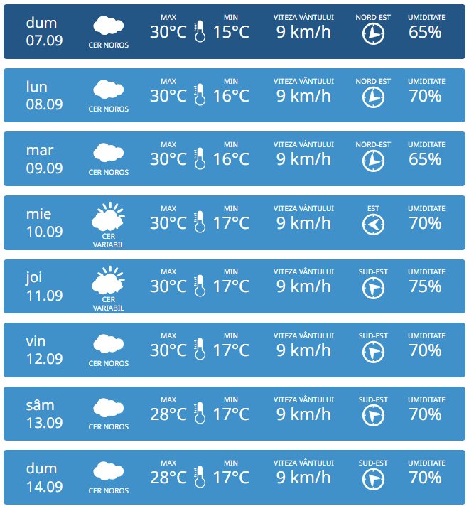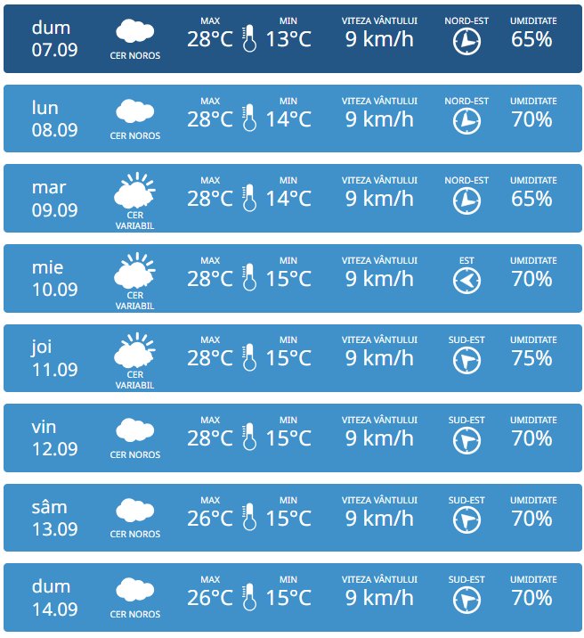 La Chișinău, în perioada 8-14 septembrie, ne așteaptă minime de 13 °C și maxime de 28 °C. Vom avea și zile cu cer variabil, și zile cu cer noros.