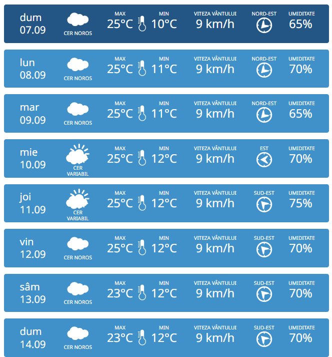 La nord, în perioada 8-14 septembrie, ne așteaptă minime de 10 °C și maxime de 25 °C. În nordul țării se prognozează mai multe zile cu cer noros, dar și cu cer variabil.