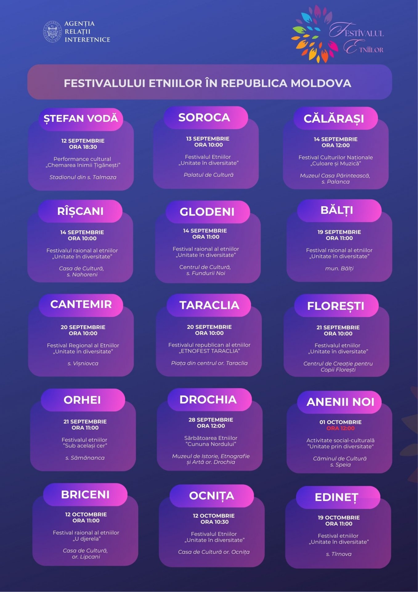 Totodată, în raioanele republicii se vor desfășura diverse activități consacrate Festivalului Etniilor.