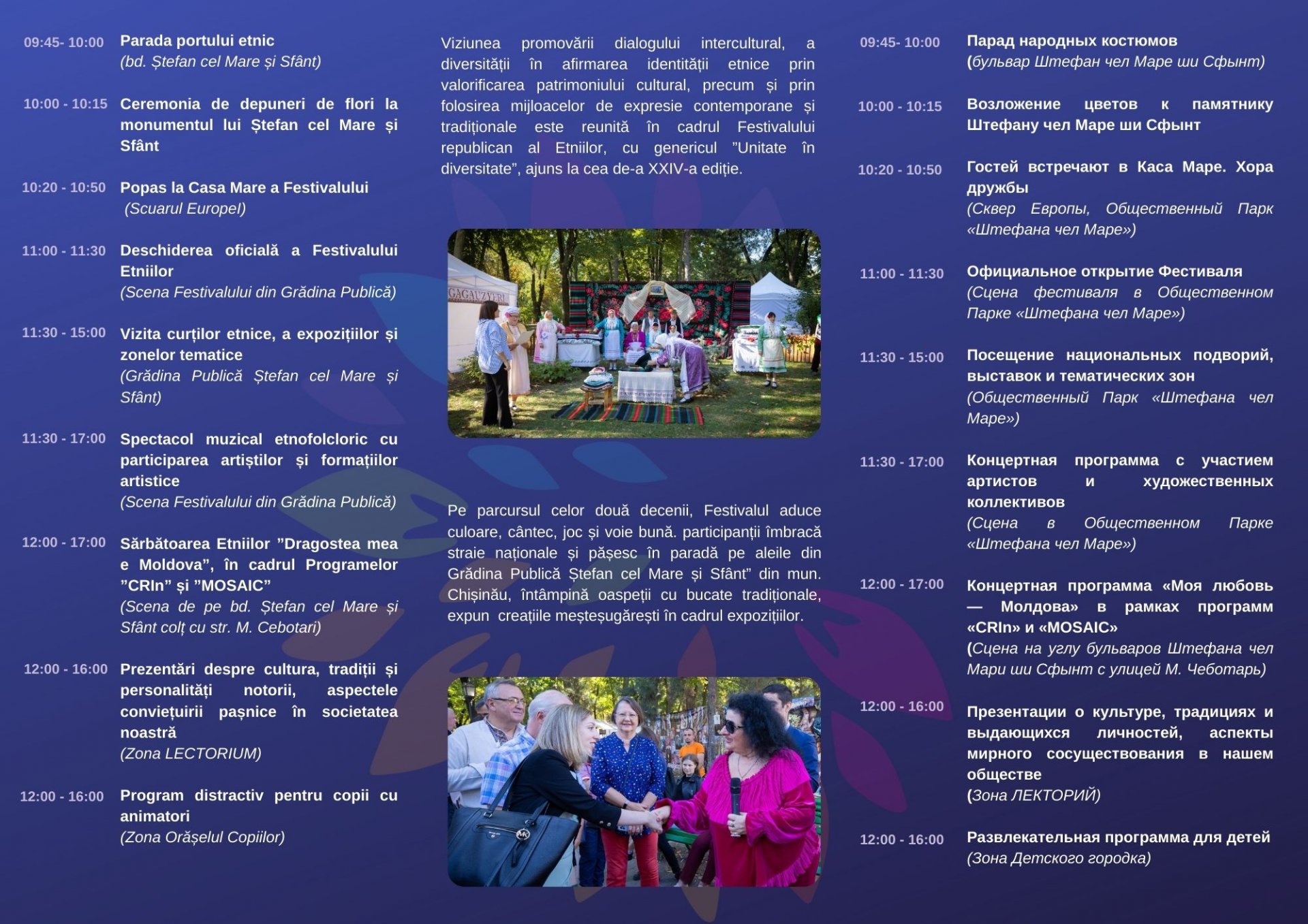 Festivalul Etniilor revine la Chișinău. Pe 21 septembrie se va desfășura cea de-a XXIV-a ediție, cu genericul „Unitate în diversitate”. Vizitatorii vor descoperi peste 20 de curți etnice cu tradiții, gastronomie și meșteșuguri autentice, spectacole de dans și muzică populară, ateliere gastronomice interactive, precum și zone dedicate copiilor.