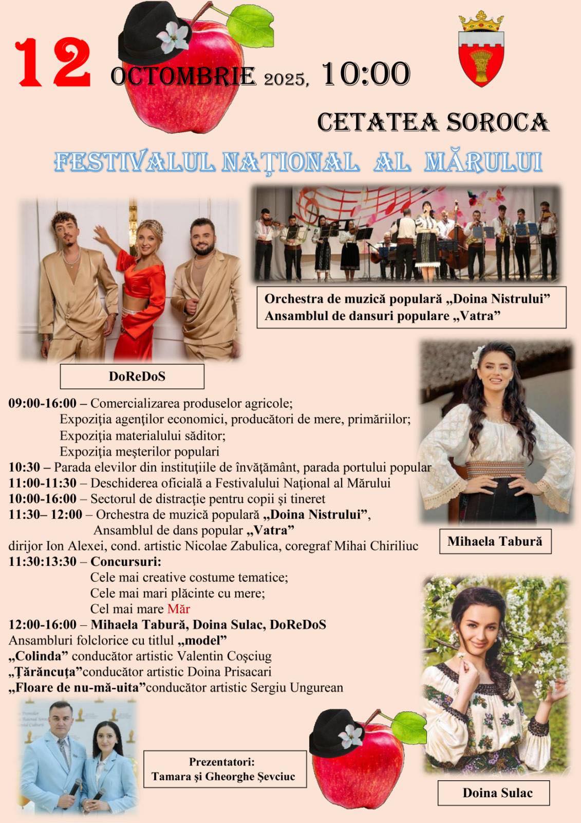 Te așteaptă o zi dedicată recoltei de toamnă, tradițiilor populare și mărului moldovenesc. Vei găsi expoziții, târguri cu produse locale, spectacole artistice și activități culturale. Intrarea este liberă.