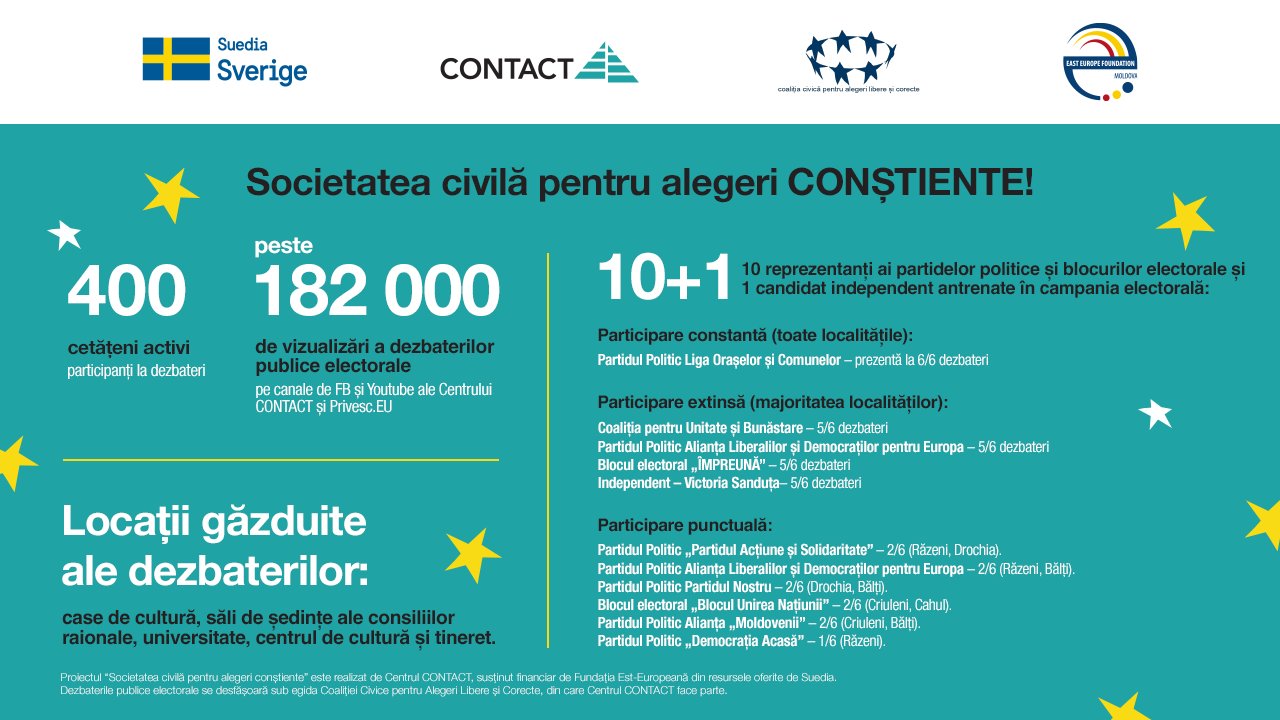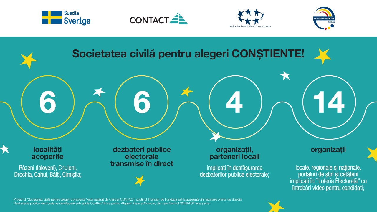 Proiectul „Societatea civilă pentru alegeri conștiente” este realizat de Centrul CONTACT, susținut financiar de Fundaţia Est-Europeană din resursele oferite de Suedia.