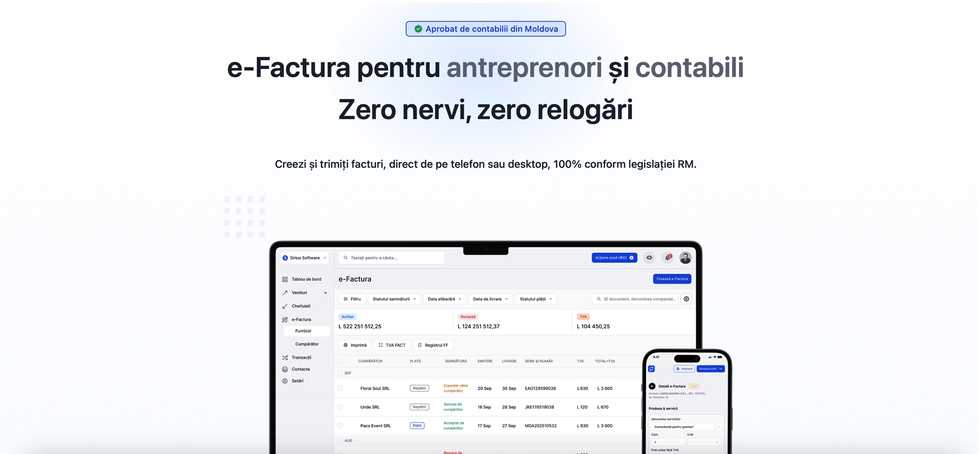 Antreprenorii și contabilii din Republica Moldova au acum acces la platforma Sirius, care permite conectarea directă cu sistemul e-Factura al Serviciului Fiscal de Stat și crearea facturilor electronice de pe telefon.