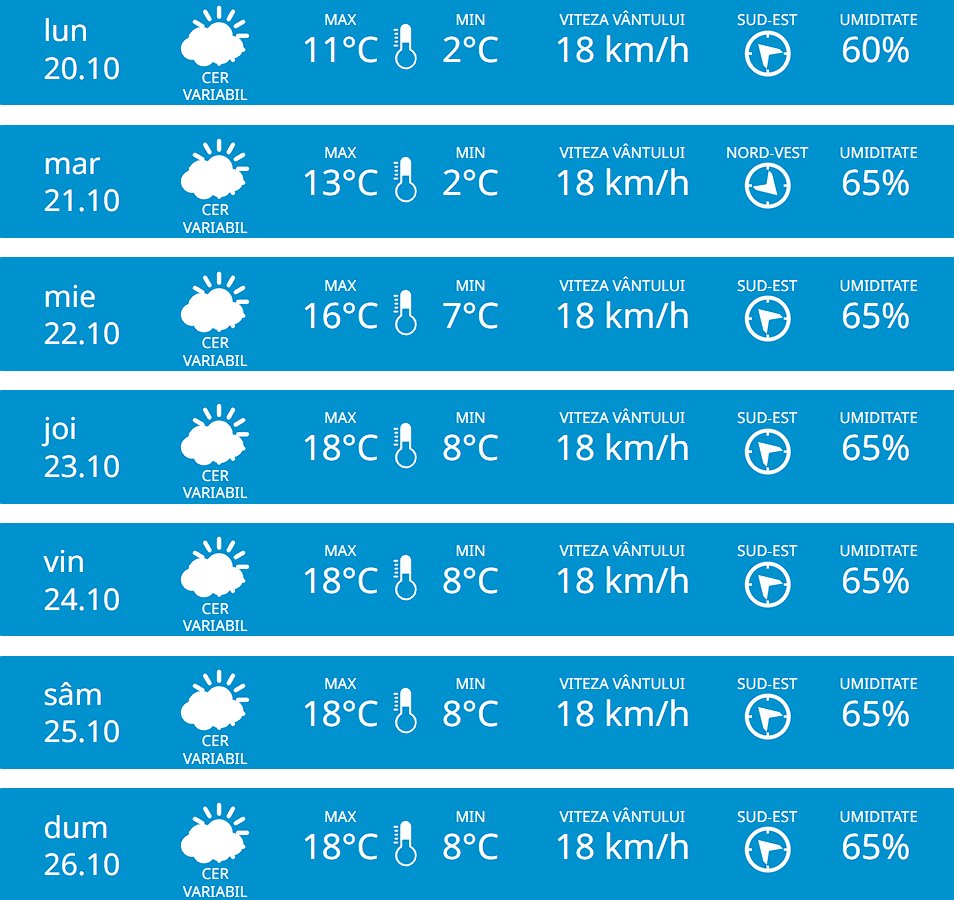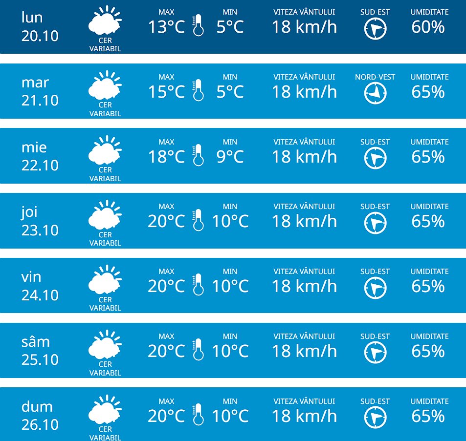 Săptămâna va începe cu maxime de până la 15 °C și cer variabil. În zilele următoare, temperaturile vor crește ușor, ajungând până la 20 °C. Umiditatea va depăși 60 %.