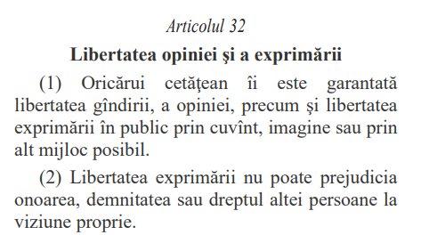 Punctul 1 din articolul 32 al Constituției Republicii Moldova garantează cetățenilor libertatea la exprimare, în timp ce punctul 2 indică asupra dreptului la viziune proprie. Comentariile critice scrise pe rețelele de socializare ale instituțiilor de stat nu lezează onoarea sau demnitatea funcționarilor publici. Respectiv, blocarea cetățenilor este o măsură neîntemeiată.