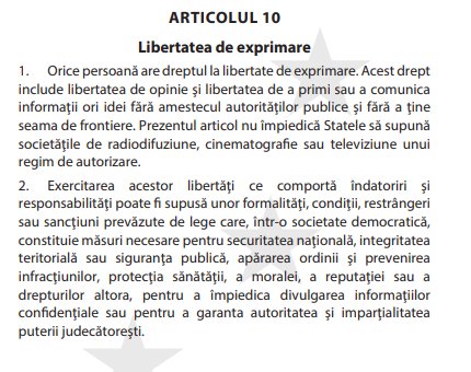 Articolul 10 din CEDO garantează libertatea de exprimare a cetățenilor. Exercitarea acestui drept poate fi supusă unor restrângeri doar atunci când este pusă în pericol securitatea națională.