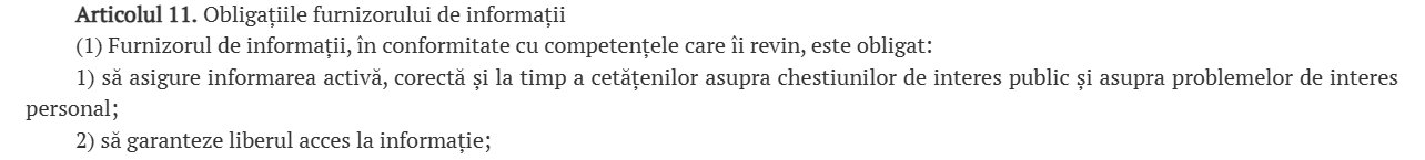Punctele 1 și 2 din articolul 11 al acestei legi menționează obligativitatea instituțiilor de stat de a asigura dreptul la informație al cetățenilor.