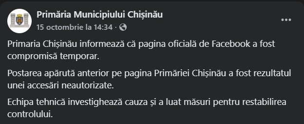 Primăria Municipiului Chișinău a scris că pagina sa de Facebook a fost compromisă, iar postarea despre ștergerea comentariilor incomode este rezultatul „unei accesări neautorizate”. Cu toate acestea, instituția de stat nu a precizat de ce în continuare unii oameni rămân blocați și nici nu a făcute publice informațiile cu privire la acel incident.