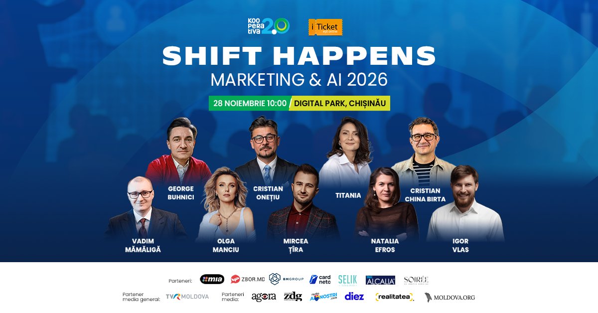 Kooperativa va organiza „Shift Happens”, o conferința despre marketing, AI și creație de conținut. Participanții vor avea posibilitate să facă networking asistat de aplicație, cu întâlniri 1:1. Acestea vor fi programate direct în agenda evenimentului, care va avea loc în data de 28 noiembrie la Digital Park.