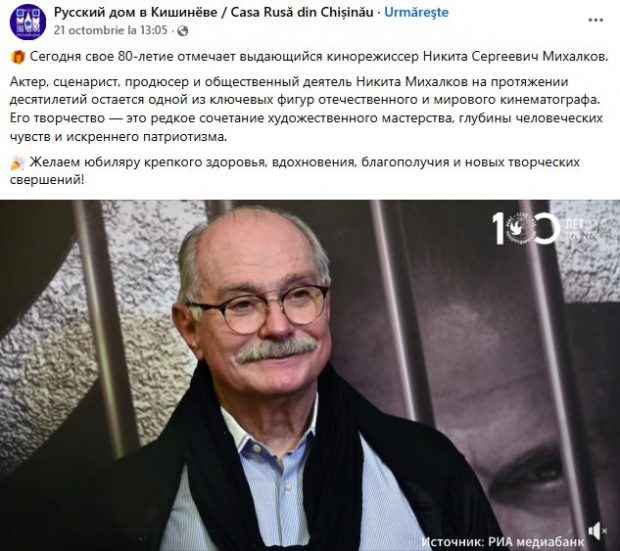 Tot în această toamnă, Casa Rusă l-a felicitat cu ziua de naștere pe regizorul Nikita Mihalkov, cunoscut pentru emisiunile sale de propagandă și sancționat în UE, Canada, Ucraina și Elveția.