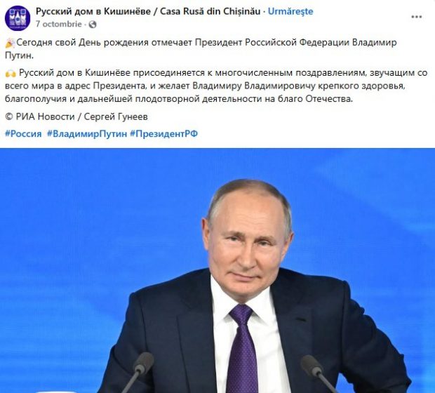 Spre exemplu, Casa Rusă a mai publicat în luna februarie un video dedicat „Zilei gloriei militare a Rusiei” și a scris o postare despre un nou număr al revistei „Câmpul rusesc”, dedicat „împlinirii a 80 de ani de la eliberarea Moldovei de sub ocupația fascistă”. Plus la aceasta, centrul a distribuit, cinstea împlinirii a 80 de ani de la „Marea Victorie”, mai multe imagini cu veterani moldoveni.
