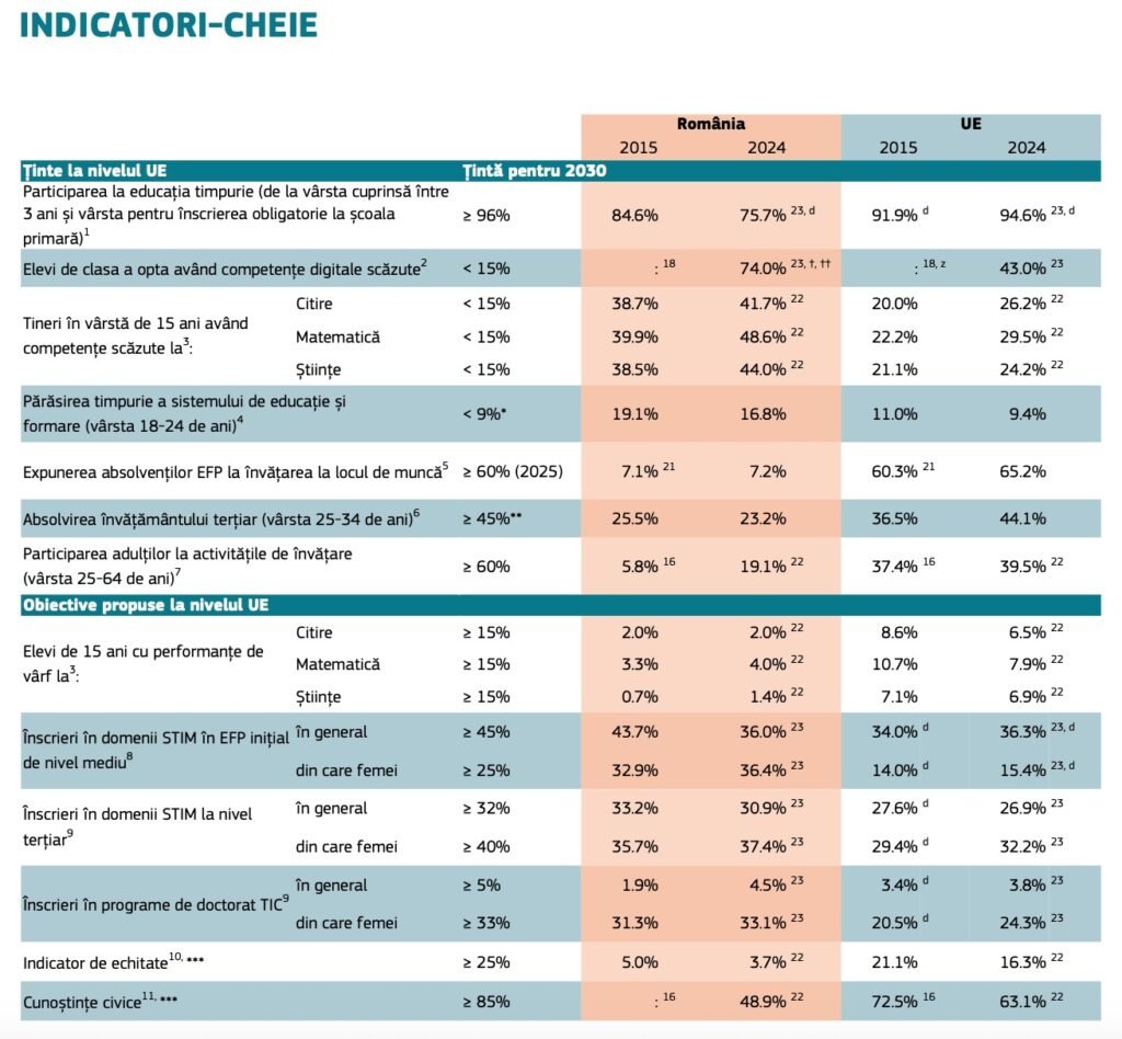 România se află pe ultimul loc în Uniunea Europeană la aproape toți indicatorii privind educația și formarea profesională. Datele au fost publicate de Comisia Europeană în Monitorul Educației și Formării 2025. Astfel, țara vecină are cea mai mare pondere a tinerilor care părăsesc timpuriu școala, 16,8 %, conform datelor din 2024.