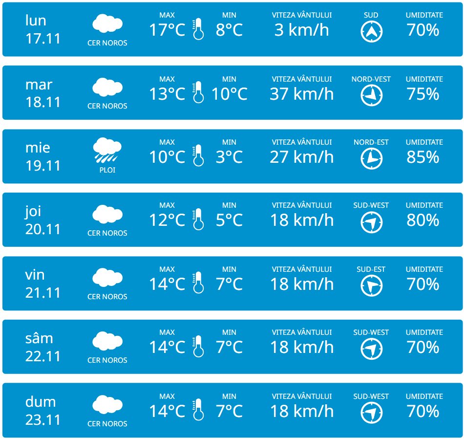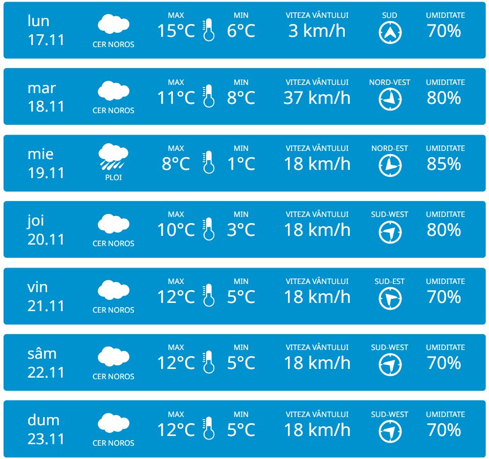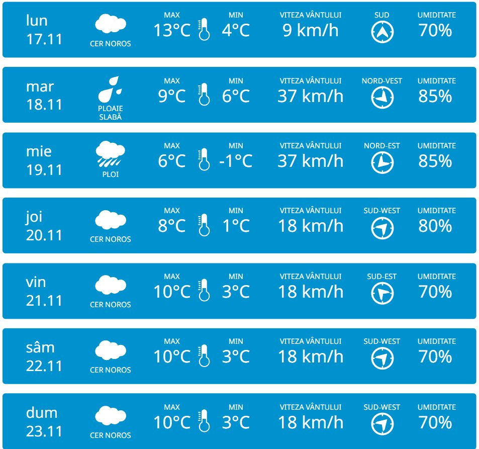 În perioada 17-23 noiembrie, vom avea parte de cer noros și chiar de precipitații. Conform prognozelor meteorologilor, marți va ploua în nordul Republicii Moldova, iar miercuri – în toată țara. Detalii despre temperaturile care ne așteaptă vedeți mai jos.