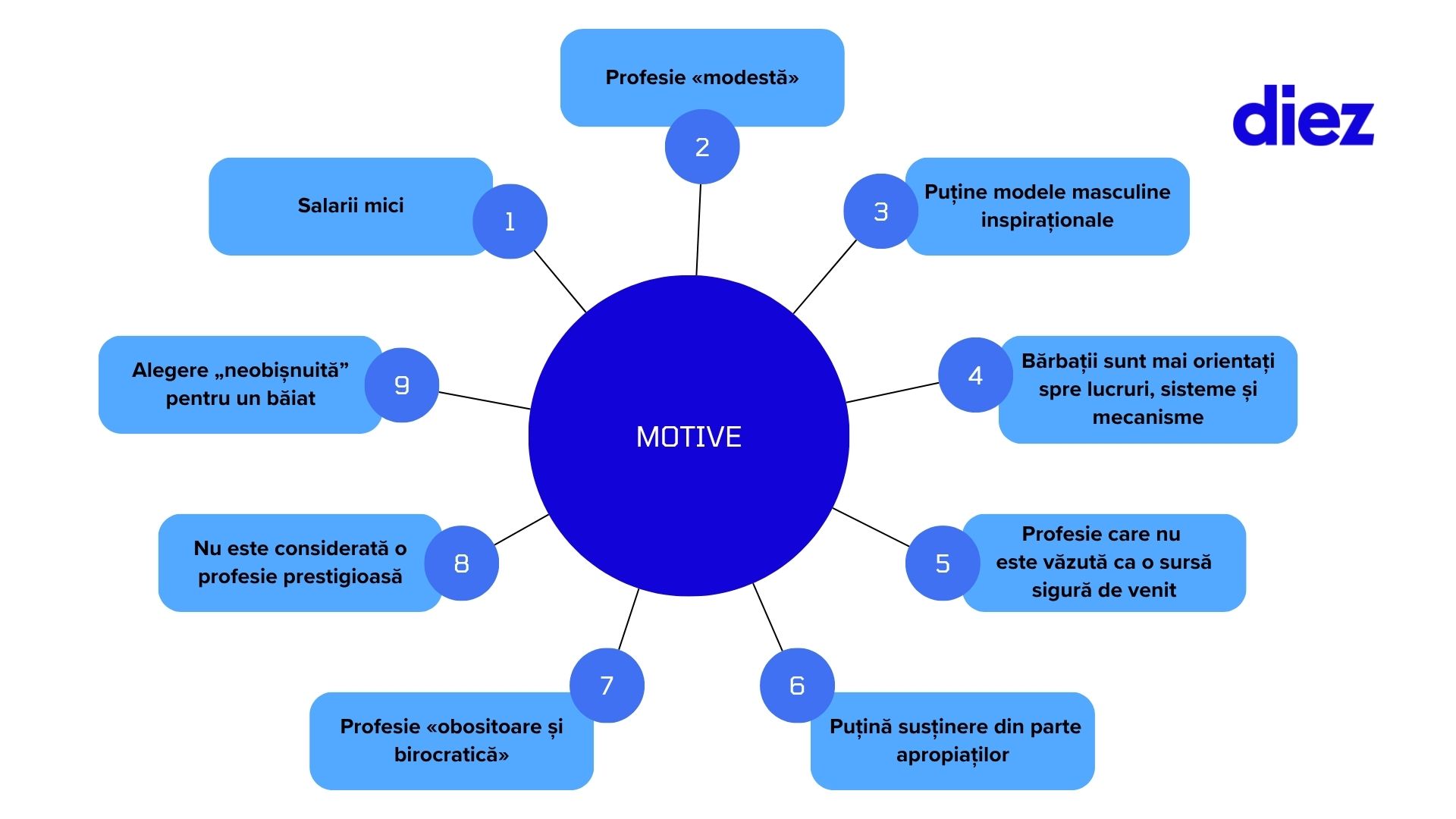 „De cele mai multe ori, băieții se orientează către domenii percepute ca fiind mai «bărbătești», cum ar fi tehnologia, științele exacte, dreptul sau antreprenoriatul. În schimb, pedagogia este adesea asociată cu trăsături precum grija, răbdarea și empatia, calități care, cultural vorbind, sunt mai des atribuite femeilor.”