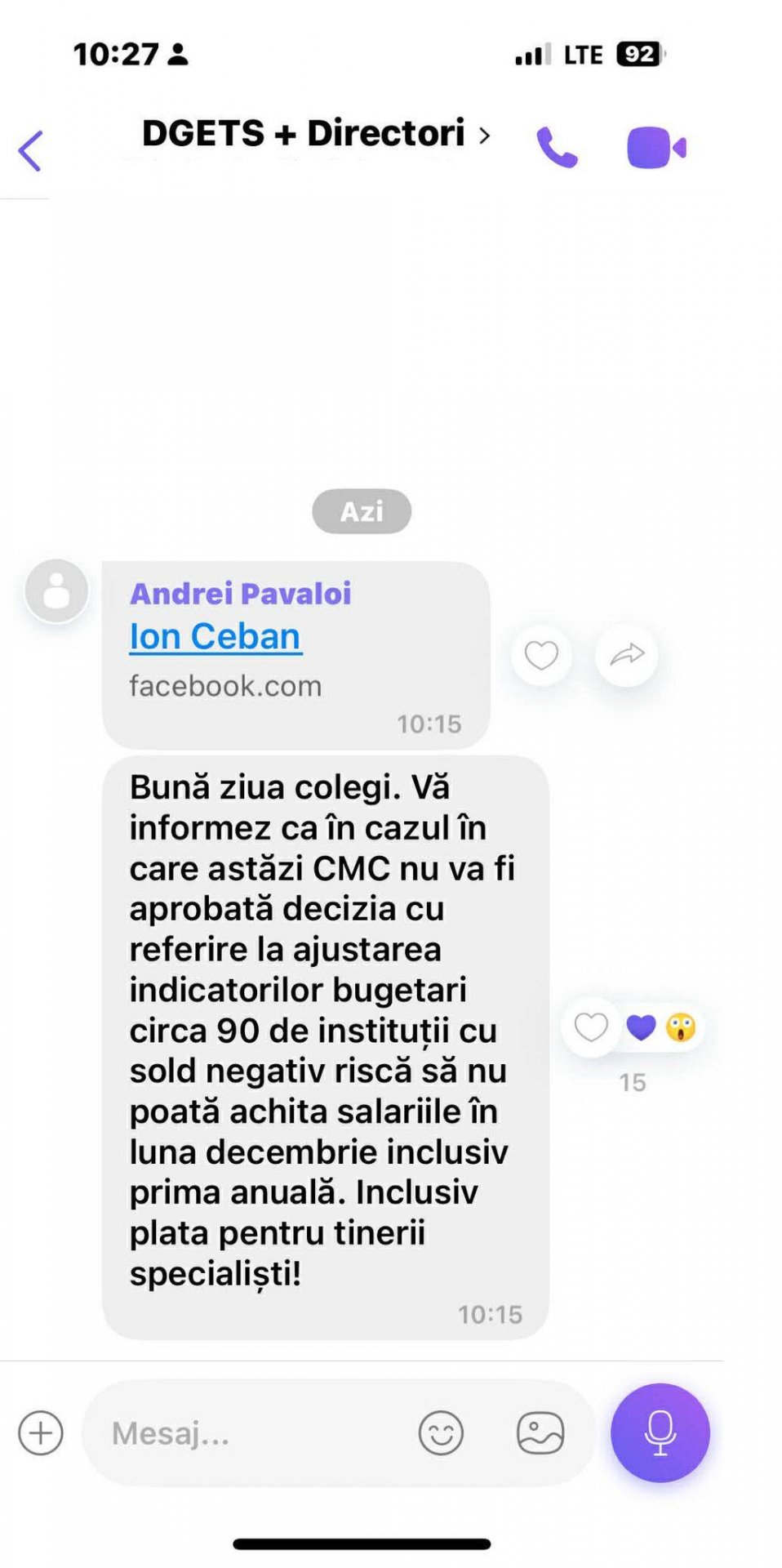 Primarul Capitalei, Ion Ceban, a declarat la ședința CMC de astăzi, 24 noiembrie, că transferul banilor către profesori poate fi făcut doar dacă Consiliul Municipal aprobă proiectul de decizie. Cu acest mesaj a venit Andrei Pavaloi, șeful-adjunct al DGETS, într-un grup al cadrelor didactice.