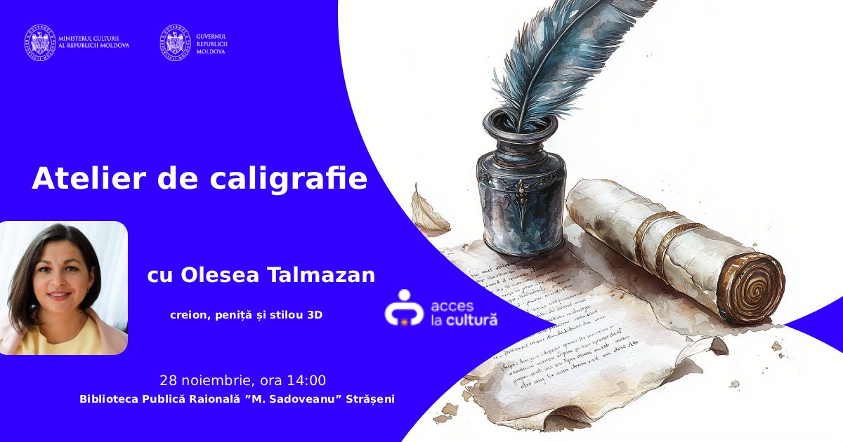 Dacă dorești să înveți tehnici de scris care pun accent pe detaliu și precizie, acest articol e pentru tine. Ministerul Culturii te invită la un atelier de caligrafie organizat la Biblioteca Publică Raională „M. Sadoveanu” din Strășeni. Evenimentul va avea loc pe 28 noiembrie, începând cu ora 14.00 și va fi ghidat de Olesea Talmazan – învățătoare la Școala Primară nr. 82.