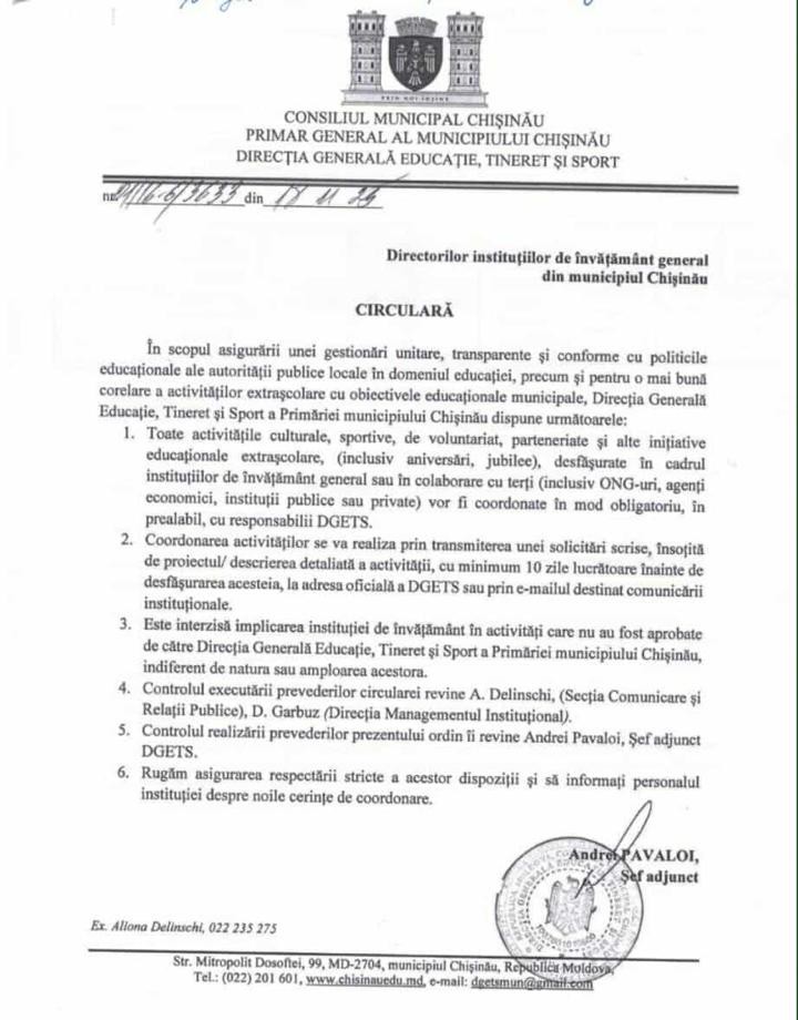 Andrei Pavaloi, șeful adjunct al direcției educaționale din Chișinău, a semnat o circulară prin care obligă instituțiile de învățământ să-și ceară mereu permisiunea de a organiza activități extrașcolare. Măsura a fost criticată dur de profesori și experți, care susțin că circulara îngreunează munca cadrelor didactice, va reduce numărul activităților din școli și reprezintă o încercare a municipalității de a controla mai strict instituțiile – inclusiv prin filtrarea persoanelor și organizațiilor care pot colabora cu acestea.