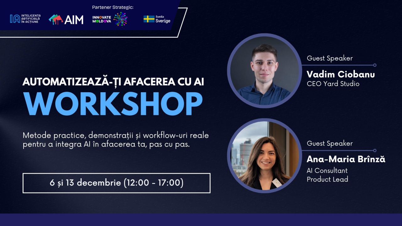 Dacă ești antreprenor IMM și simți că sarcinile repetitive îți consumă tot timpul, atunci participă la un workshop practic și descoperă metode simple de automatizare cu Inteligența Artificială pentru a reduce munca manuală, a elimina erorile și a-ți eficientiza procesele zilnice. Workshopul va avea loc în două zile, pe 6 și 13 decembrie 2025.