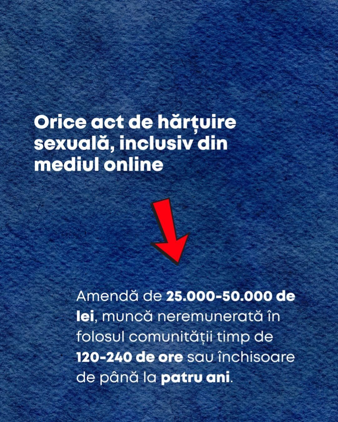 Sancțiunile pentru orice formă de hărțuire, inclusiv cea digitală, vor crește. Amenda se va mări de la 25.000-32.500 de lei la 25.000-50.0000 de lei. Munca neremunerată în folosul comunității va crește de la 120-180 de ore la 120-240 de ore. Pedeapsa cu închisoarea, care anterior era de până la doi ani, va ajunge la până la patru ani.