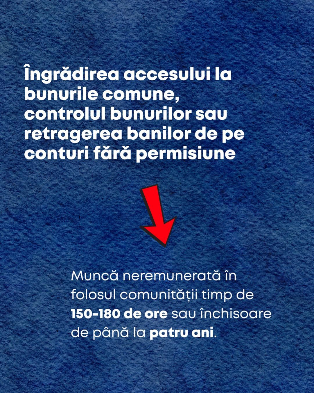 O altă modificare va permite pedepsirea agresorului în situațiile în care nu îi permite victimei să folosească bunurile comune, controlează bunurile acesteia sau scoate bani de pe conturile ei fără permisiune. Pedeapsa va constitui muncă neremunerată în folosul comunității de la 150 la 180 de ore sau cu închisoare de până la patru ani.