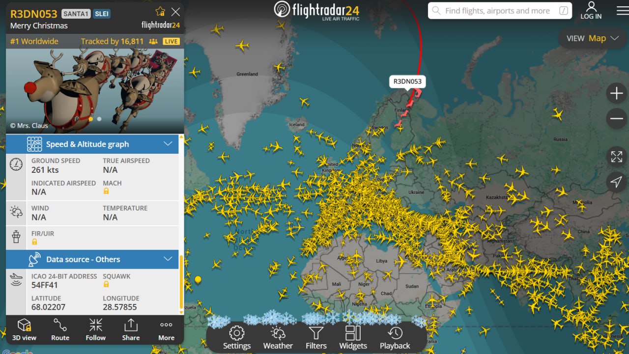 Flightradar24 publică anual traseul lui Moș Crăciun în scop de divertisment.