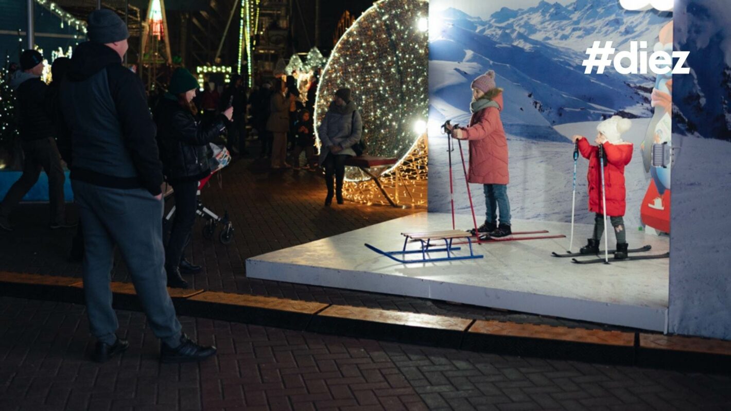 Printre zonele foto de la târg se regăsește o instalație cu sănii și schiuri, amplasată pe fundalul munților înzăpeziți.
